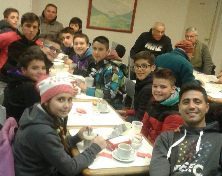 Antes del lío. La cena previa al problema con el gas. Adelante, el técnico “Tincho” Ginestar con su hija. Detrás los jugadores del equipo de Richet.