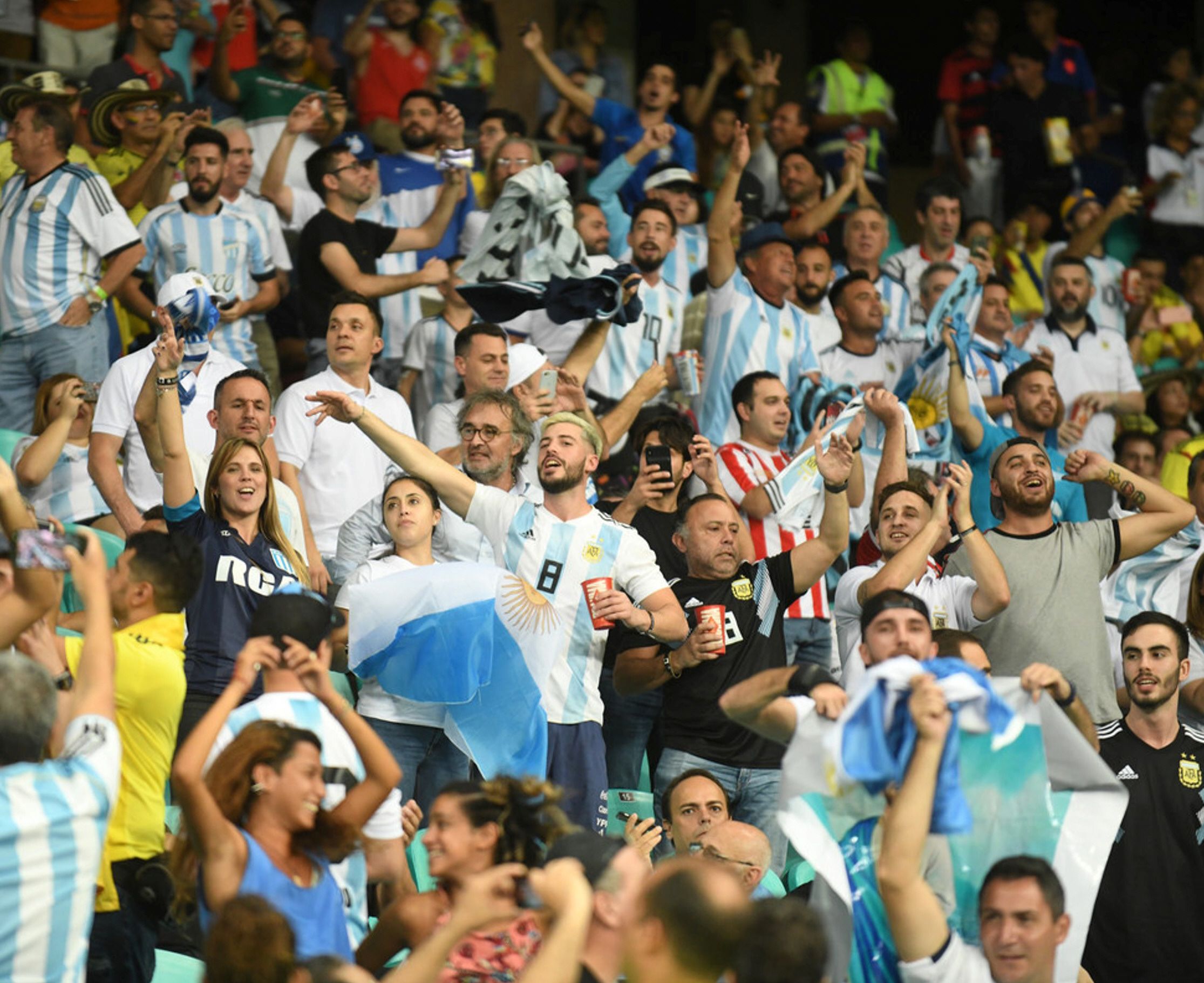 Los hinchas argentinos y colombianos bailaron al ritmo de la batucada Tambores e Cores y se fotografiaron, aunque los colombianos aprovecharon para gastar por la victoria de ayer y recordaron la goleada del 5-0. "Volveremos, volveremos. Volveremos otra vez, a ganarles 5 a 0, como en el 93", gritaron cientos de gargantas, mientras los argentinos escuchaban sonriendo, irónicamente.