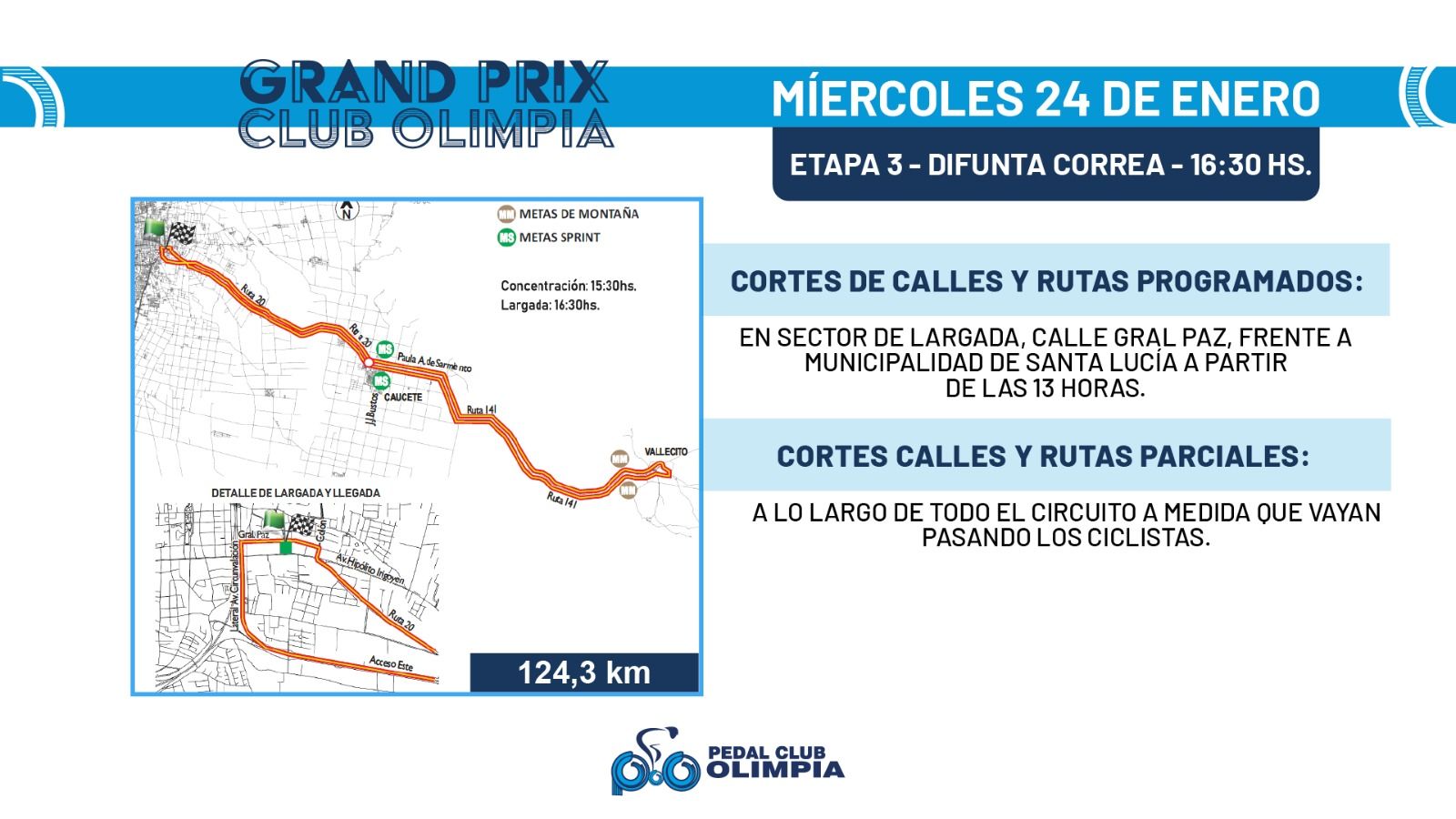 Se viene la tercera etapa del Grand Prix del Pedal Club Olimpia, que este miércoles 24 de enera recorrerá, desde las 16:30, 124 kilómetros aproximadamente uniendo, ida y vuelta, el departamento Santa Lucía con la Difunta Correa.