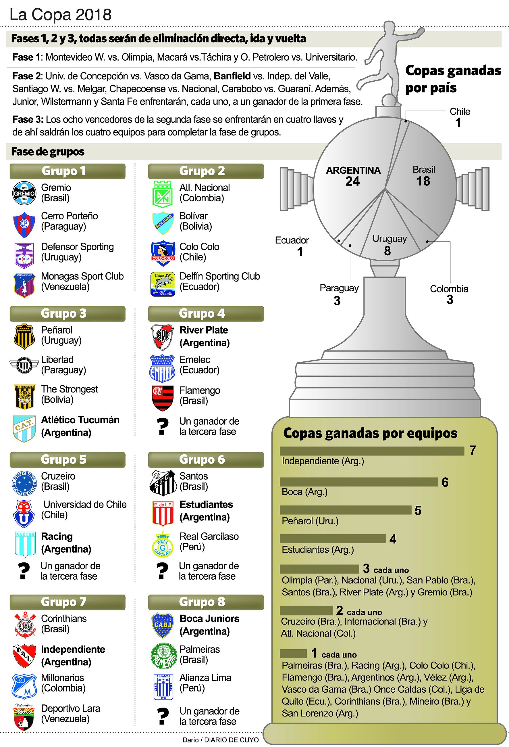 A los equipos argentinos les tocó enfrentarse con pesos pesados de Brasil: el “Millonario”, tal vez el más aliviado, enfrentará a Emelec, mismo rival de la edición pasada. Si bien no hay altura en Ecuador, sí sufrirá un viaje largo. Luego aparece Flamengo, que fue finalista de la Copa Sudamericana. Boca integra el Grupo 8 y le tocará enfrentar a Palmeiras, con el que tuvo cruces muy difíciles en 2000 y 2001, cuando logró el bicampeonato de la mano de Carlos Bianchi. Le sigue Alianza Lima de Perú y el restante equipo complicado que podría clasificarse desde las fases previas aparecen Olimpia y Junior de Barranquilla de Teófilo Gutiérrez. Independiente es el más complicado, porque irá a la altura y jugará ante el campeón de Colombia y de Brasil. Sus rivales en el Grupo 7 son Corinthians, Millonarios y Deportivo Lara. Racing, por su parte, integra el Grupo 5 con Cruzeiro y Universidad de Chile, y podría tocarle el Vasco Da Gama.