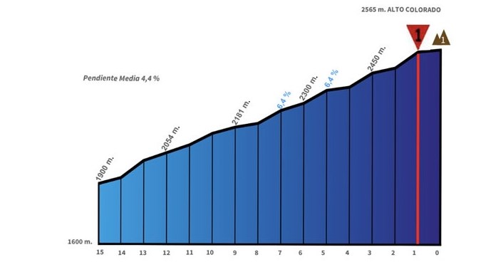 El Colorado es un puerto de primera categoría y 14,4 Km de ascenso que salva un desnivel de 665 metros. Antes, además, se ascenderán otros tres puertos: uno de tercera (Villicum) y dos de segunda (Talacasto y Las Crucecitas), lo que significa que los ciclistas se pasarán gran parte del día subiendo.