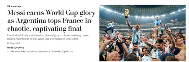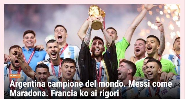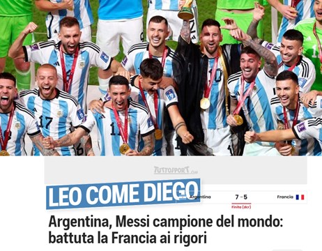 La Gazzetta dello Sport de Italia tituló: "Argentina campeona del mundo: Messi como Maradona. Francia eliminada en los penales". "¡Y Messi se hizo D10S! Argentina conquistó el Mundial en los penaltis tras un final épico y una batalla para la historia entre él y Mbappé. Coman y Tchouameni fallaron sus tiros. Tercera estrella para Argentina", tituló As de España.