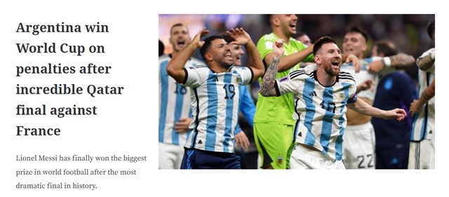 Los medios del mundo destacaron la obtención del Mundial Qatar 2022 de la Selección argentina y elogiaron tanto el desempeño del equipo como del capitán Lionel Messi. En ese sentido, el título del mundo tras vencer en la final a Francia 4-2 en la definición por penales, tras igualar 3 a 3 no pasó inadvertido para los principales periódicos del Planeta.