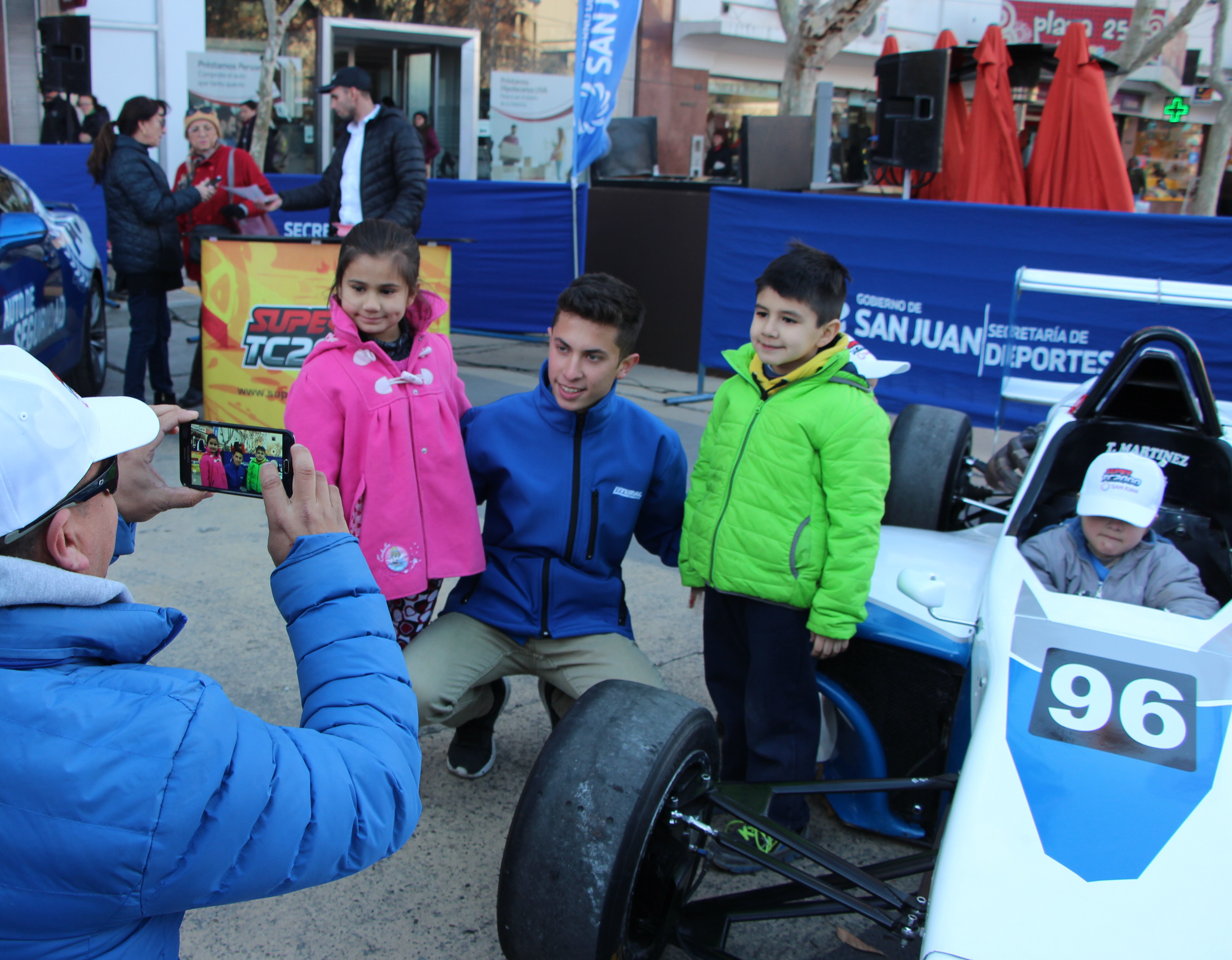 En casa. Tobías Martínez participó de la acción promocional que se desarrolló frente a la plaza 25 de Mayo y fue uno de los más buscados por los asistentes a la hora de las fotos. Hoy el sanjuanino empezará a acelerar en el autódromo.