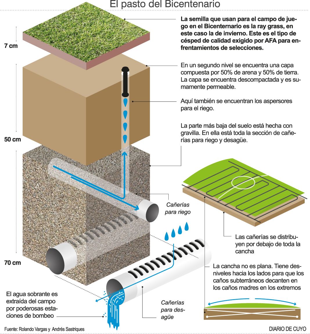 Al mando de Rolando Vargas, el encargado del Bicentenario, y de Andrés Sastriques, quien cumple la función de director de control operativo, el campo de juego se atiende durante todo el año, por más que no tenga actividad. No importa que sea día domingo o feriado. Incluso el resembrado que se realizó con miras a este partido del seleccionado, se hizo el Jueves Santo. Ese día se echaron los mil kilos de semilla en la cancha principal y al día siguiente, el Viernes Santo, se resembró la cancha auxiliar donde mañana se entrenará Nicaragua. De ahí en más se trabaja en sobreturno para que el "bebé mimado" llegue en las mejores condiciones. "Ayudó mucho el buen clima porque no tuvimos grandes heladas. A los cuatro días de haber resembrado ya tuvimos la semilla germinada. A los 10 días ya le hicimos el primer corte pero antes también le dimos de comer", contó Vargas refiriéndose al fertilizante que se le echó para endurecer la corona.