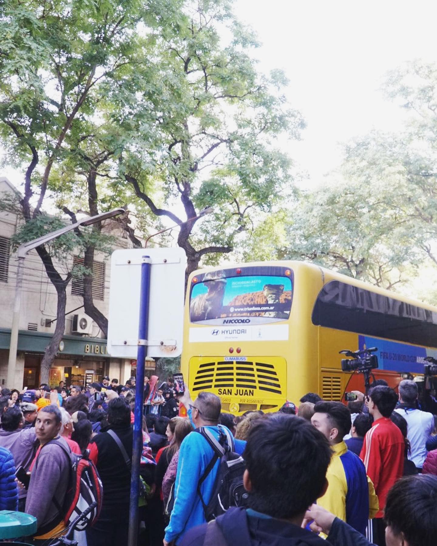 El seleccionado encabezado por el DT Javier Mascherano arribó al Hotel Alkazar pasadas las 14, pero el aguante sanjuanino se hizo notar desde las 12 aproximadamente. Los cortes de calles aledañas llamaron la atención y hasta los más desprevenidos se acercaron al alojamiento ubicado en Laprida entre Mendoza y General Acha.