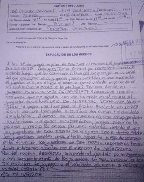 El juez explicó que expulsó al jugador visitante Franco Emanuel Rodríguez por agredirlo y se desencadenó un tumulto en el que participaron "jugadores sustitutos" entre los que identifica al número 3, diciendo que le "arrojó el balón en forma violenta impactando en mi rostro" a la vez que aclaró que lo expulsó pero no le mostró la tarjeta roja.
