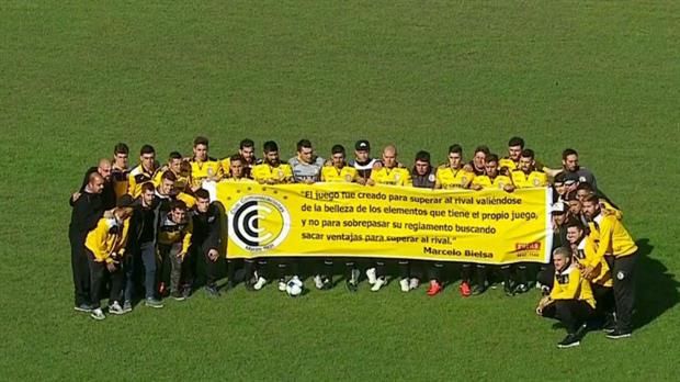 Los jugadores del club de Agronomía sorprendieron al salir a la cancha y posar con una bandera que contenía una frase de Marcelo Bielsa, y que la volvieron a desplegar en el final.
