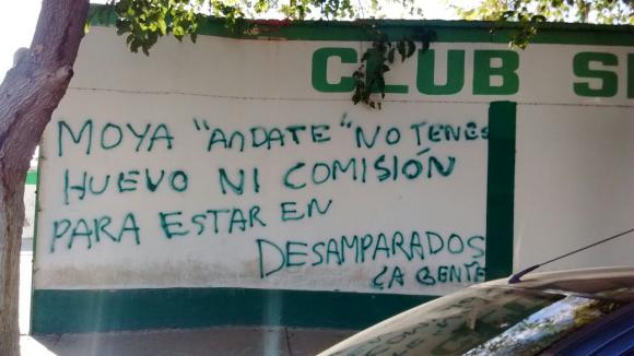 El clima en Sportivo está caldeado y así lo demostraron sus hinchas al pintar una pared perimetral del Serpentario, en el Barrio Patricias Sanjuaninas, con una leyenda que expresa “Moya andate no tenés huevos ni comisión para estar en Desamparados. La gente”.