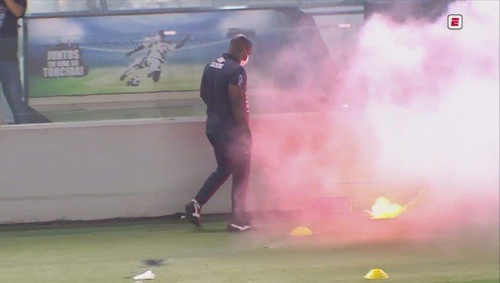 Cuando los futbolistas ya estaban preparados para iniciar el partido, dos bengalas aparecieron dentro del campo de juego del pequeño Villa Belmiro y hasta podrían haber lastimado a algunos de los jugadores. De hecho, debieron ingresar auxiliares para apagarlas y evitar inconvenientes mayores, además de permitir el comienzo del partido.