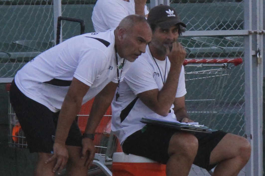 De charla. El técnico Rubén Darío Forestello conversa con el profe Diego Burkhard, durante uno de los partidos. El "Yagui" quedó conforme con lo mostrado por los jugadores.