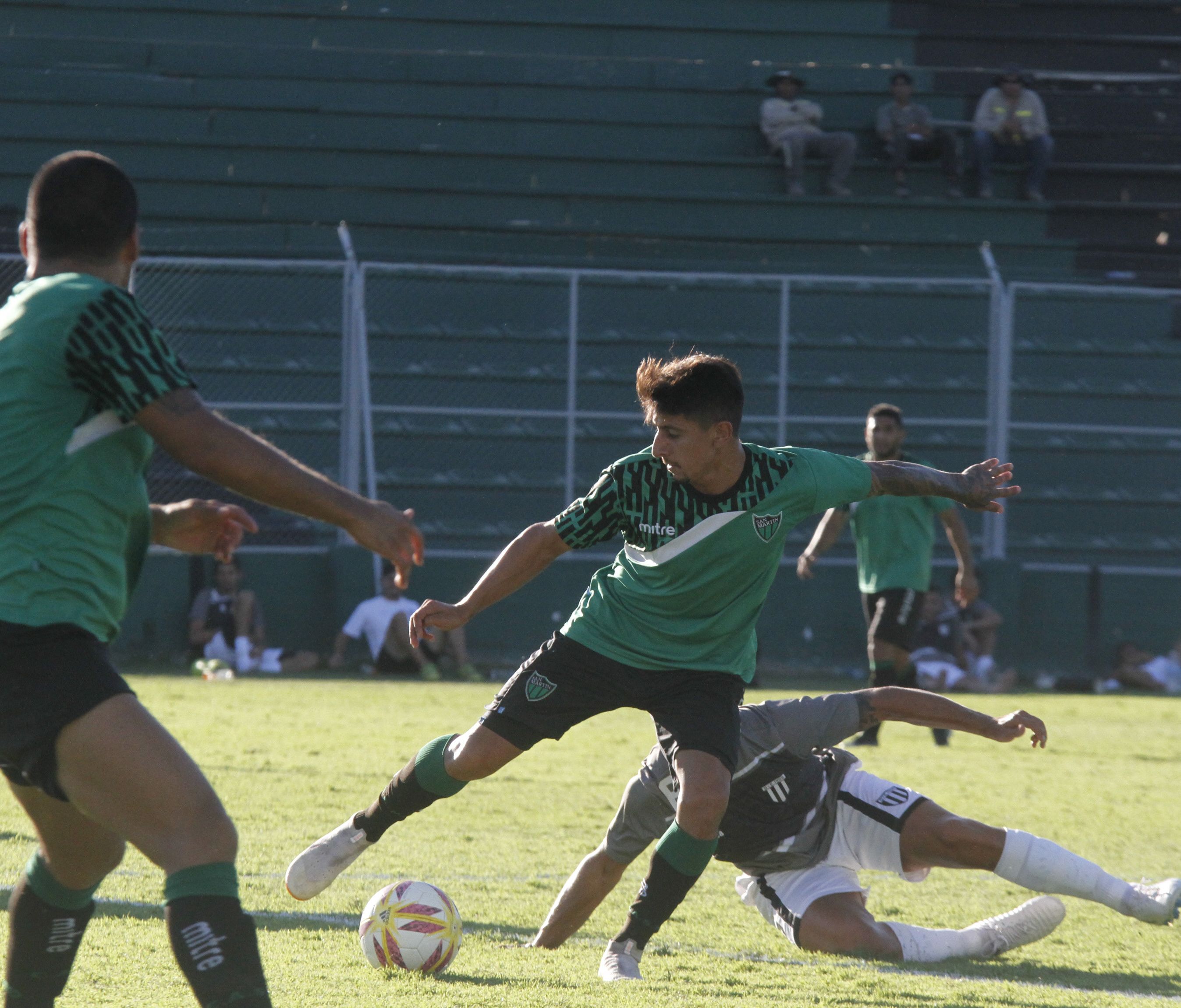Sin suerte. Gustavo Villarruel deja en el piso a su marcador, durante el segundo partido entre verdinegros y el Lobo mendocino. Salió un partido con varios goles que San Martín lo pudo empatar.