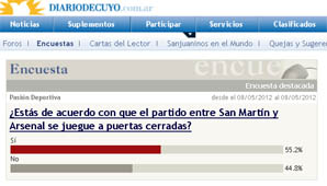 San Juan, 9 de mayo.- Luego de la sanción tomada por el Comité Ejecutivo de la AFA, por los disturbios ocasionados por los hinchas de San Martín en los partidos frente a Vélez Sarsfield y Godoy Cruz de Mendoza, la mayoría de los lectores de DIARIO DE CUYO ON LINE se manifestó de acuerdo con la medida.