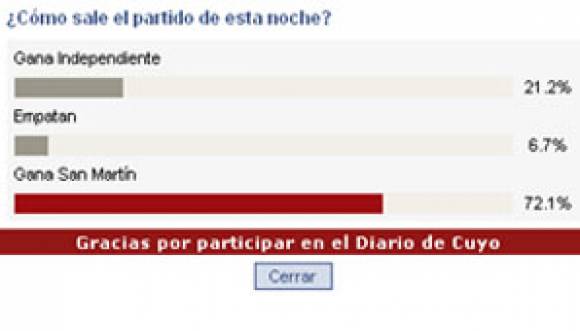 San Juan, 9 de mayo.- Claro está que el partido de esta noche es trascendental para las aspiraciones de San Martín, como así también para las de Independiente. Por eso, DIARIO DE CUYO ONLINE realizó una encuesta para conocer la opinión de los lectores.