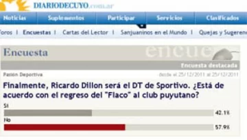 Sin embargo, una vez consumada la vuelta del “Flaco”, los lectores se mostraron en desacuerdo con el regreso en u nuevo sondeo. Esta tarde DIARIO DE CUYO ONLINE realizó una nueva encuesta con la consigna: “Finalmente, Ricardo Dillon será el DT de Sportivo. ¿Está de acuerdo con el regreso del "Flaco" al club puyutano? De la misma participaron 266 personas de las cuales el 57,9% se mostró en desacuerdo con el nuevo DT y al restante 42,1% le pareció bien que Dillon se convierta en el nuevo técnico de Sportivo.