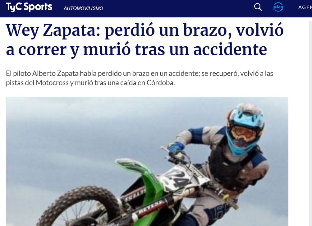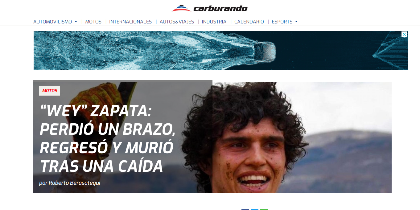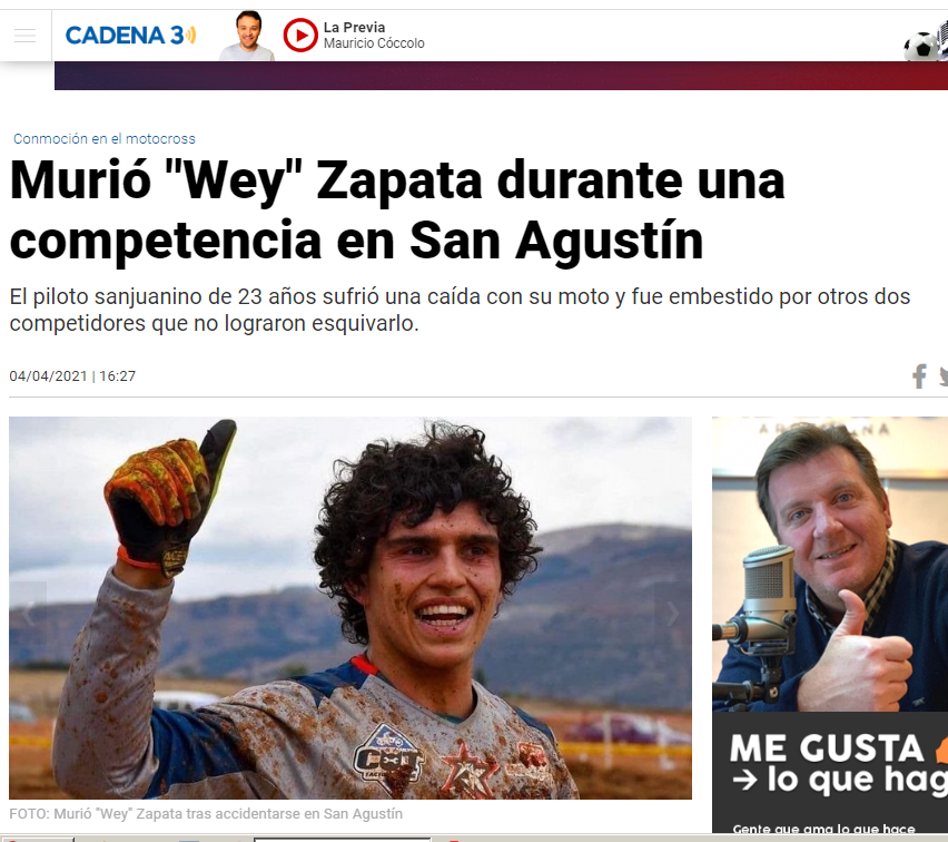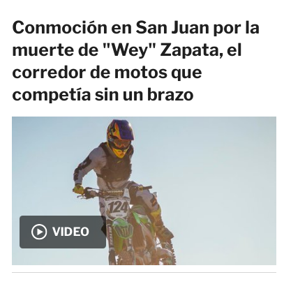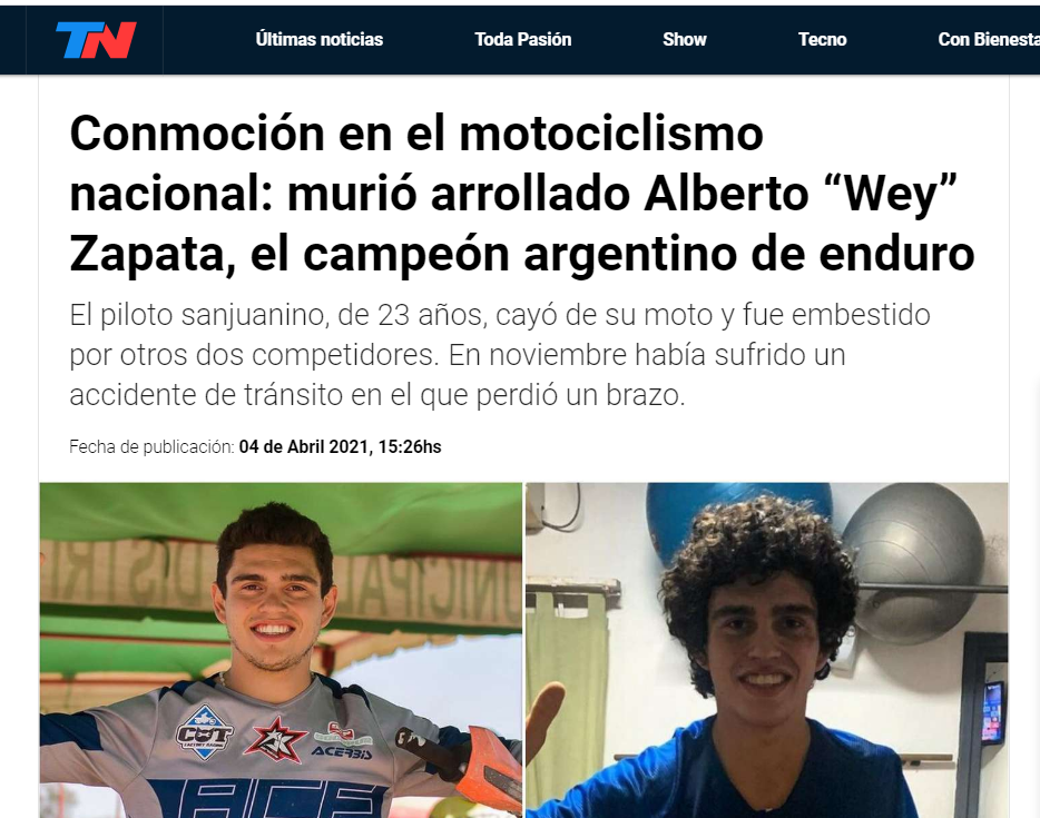 Diferentes portales de noticias se hicieron eco de la trágica muerte del sanjuanino Alberto "Wey" Zapata, quien sufrió una caída durante una carrera y falleció este domingo en la mañana.