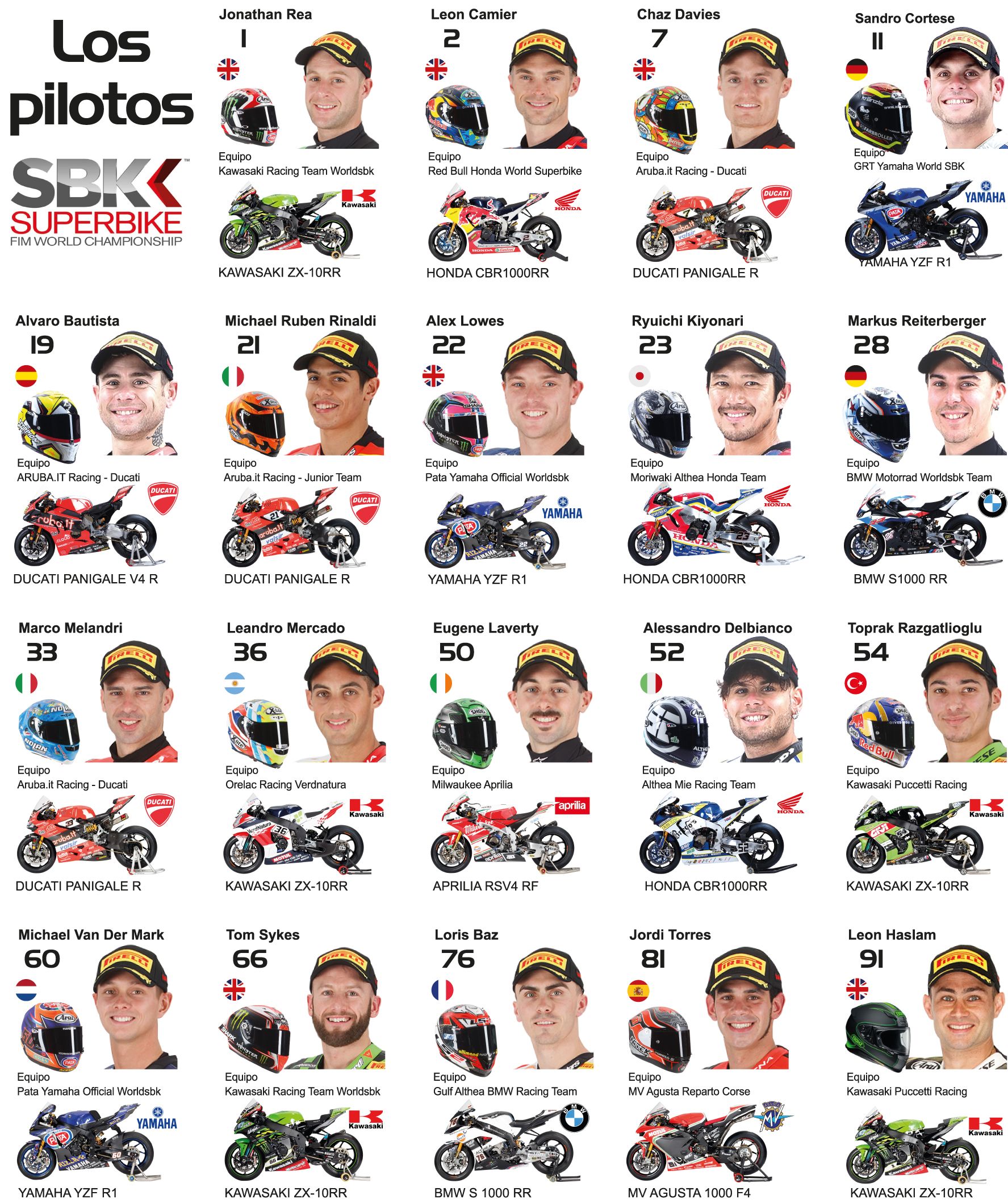 El Mundial de Superbike llega con sus pilotos más destacados, en el que se destaca el multicampeón Jonathan Rea, la gran aparición del español Alvaro Bautista, el talentoso turco Toprak Razgatlioglu y del único argentino en la categoría, el cordobés Tati Mercado.