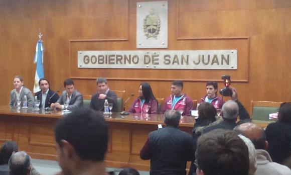 La maratonista Viviana Chávez, el triatleta Gonzalo Tellechea y el rider Gonzalo Molina estuvieron junto a sus familias en Casa de Gobierno y brindaron una conferencia de prensa en la que se despidieron de sus comprovincianos, debido a que en los próximos días encararán la parte fuerte de la preparación para la cita de agosto próximo.