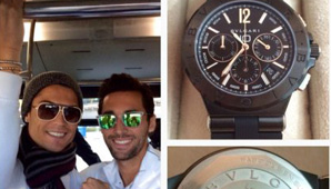 En la imagen tomada antes de viajar a Almería, aparece Arbeloa posando con el futbolista portugués y exhibiendo el reloj de la marca Bvlgari con su nombre inscripto.