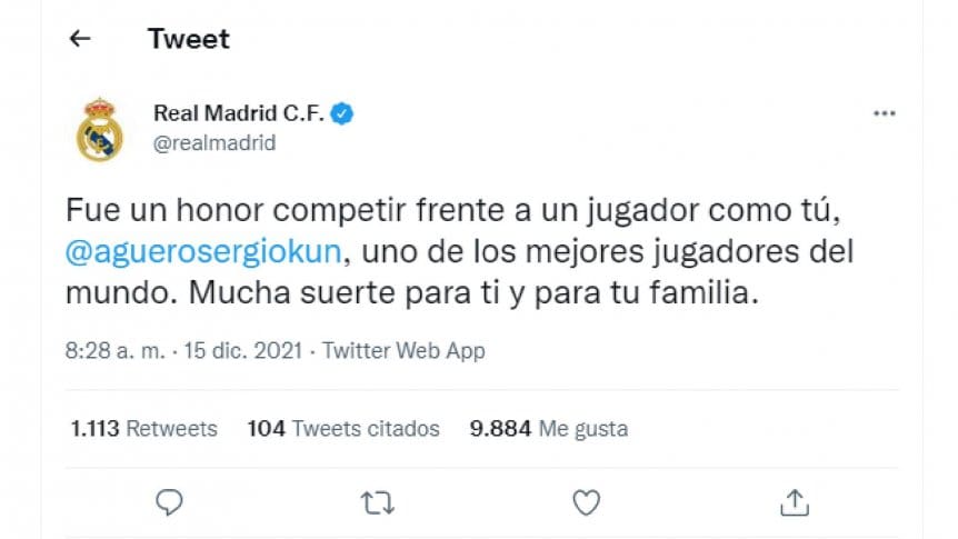 "¡Muchas gracias, Kun! Tu leyenda se agigantará con el paso del tiempo. Recordaremos con alegría tus goles, tu habilidad y tu sonrisa con la pelota en los mejores clubes del mundo y en Argentina. ¡Todas las fuerzas en este momento, @aguerosergiokun!".