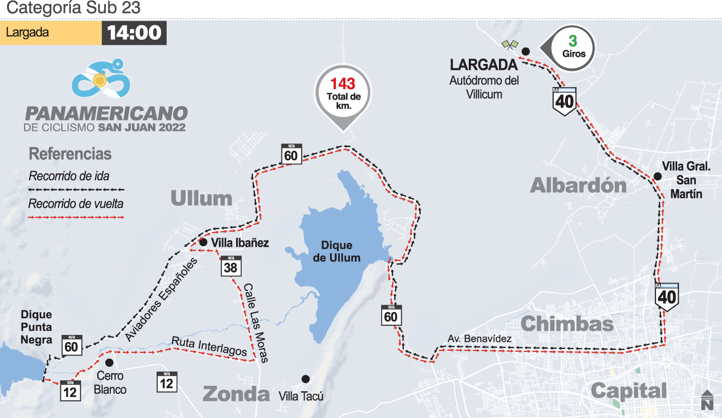 Serán 143, exigentes, kilómetros que llevarán al racimo de pedalistas hasta la pintoresca zona del Dique de Punta Negra, atravesando, también, el Dique de Ullum. Y si bien los ascensos a dichos parajes pueden "romper piernas" y atomizar al grupo en varios pedazos; el largo regreso, en descenso, casi constante puede servir para conectar cualquier fuga, siempre y cuando quienes se hayan escapado no sean pedalistas de equipos fuertes, porque si arriba quedan en la "selección" hombres de las selecciones más fuertes, quienes deberán asumir la responsabilidad de la persecución tendrán que sudar la gota gorda para alcanzar, primero, y para bancarse los ataques que se producirán en la Ruta 40 previo al ingreso al autódromo, teniendo en cuenta que apenas se ingresa a Albardón, pasando la estación de servicio, el camino empieza a empinarse hasta el autódromo. No se nota, pero el falso plano, con más de 100 kilómetros en las piernas, puede ser letal para las aspiraciones de aquellos más fuertes y más veloces. En ese tramo, los rodadores, tratarán de "limpiarse" a los galgos para dirimir en el autódromo las medallas. En la pista de 4.266 metros darán tres giros para culminar un esfuerzo que exigirá a todos dar lo mejor de sí.