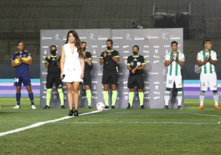 Pese a no contar con el marco de público que amerita una final como la de anoche, la previa del choque por el título tuvo importantes condimentos. Uno de ellos fue el show de luces que se desplegó sobre las cuatro tribunas del Bicentenario para darle un hermoso colorido al lugar donde habitualmente van los fanáticos. Uno de los momentos más emotivos y esperados fue la entonación del Himno Nacional de nuestro país que en este caso estuvo a cargo de Ángela Leiva, la cantante de cumbia romántica que fue finalista del programada "Cantando por un sueño". Antes de este momento, se produjo un homenaje muy particular para Diego Maradona: es que un grupo de exfutbolistas que son también músicos como Pablo Bezombe, Pablo Lugüercio, Héctor Bracamonte, Marcos Angeleri y Gonzalo Rodríguez entonaron la canción en honor al Diez, "La mano de Dios". La hizo famosa en su momento el cuartetero Rodrigo, quien incluso se la cantó en vivo y directo al Pelusa en el 2000, cuando este transitaba su rehabilitación en Cuba de las adicciones. Los fuegos artificiales también formaron parte de la antesala del choque por la gloria e iluminaron el cielo pocitano, en una noche donde San Juan resultó el epicentro de la pasión nacional, aunque fuera sin público como marcan los tiempos de la pandemia.