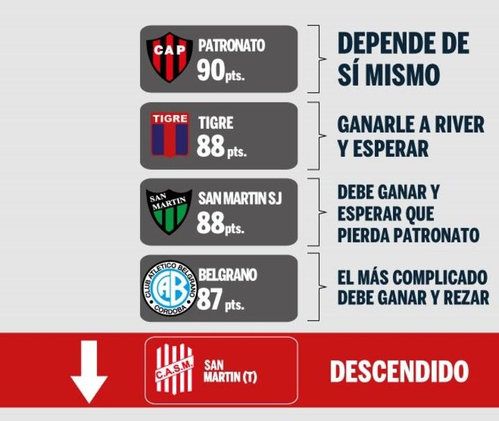 Para soñar con la salvación, a San Martín (SJ) no le queda otra opción que ganar y esperar por una caída/empate de Patronato. Hasta hoy, nunca pudo superar a Talleres de local en Primera (2 cruces: 1-3 en 2016 y 1-1 en 2018). Sus únicos 2 duelos se jugaron en San Juan. El equipo de Rubén Forestello acumula 7 fechas sin triunfos (4E-3P). Su última victoria fue 3-0 a Estudiantes (Fecha 17). El cuadro de Juan Pablo Vojvoda llega de 2 caídas, pero ganó sus últimos 2 de visitante.