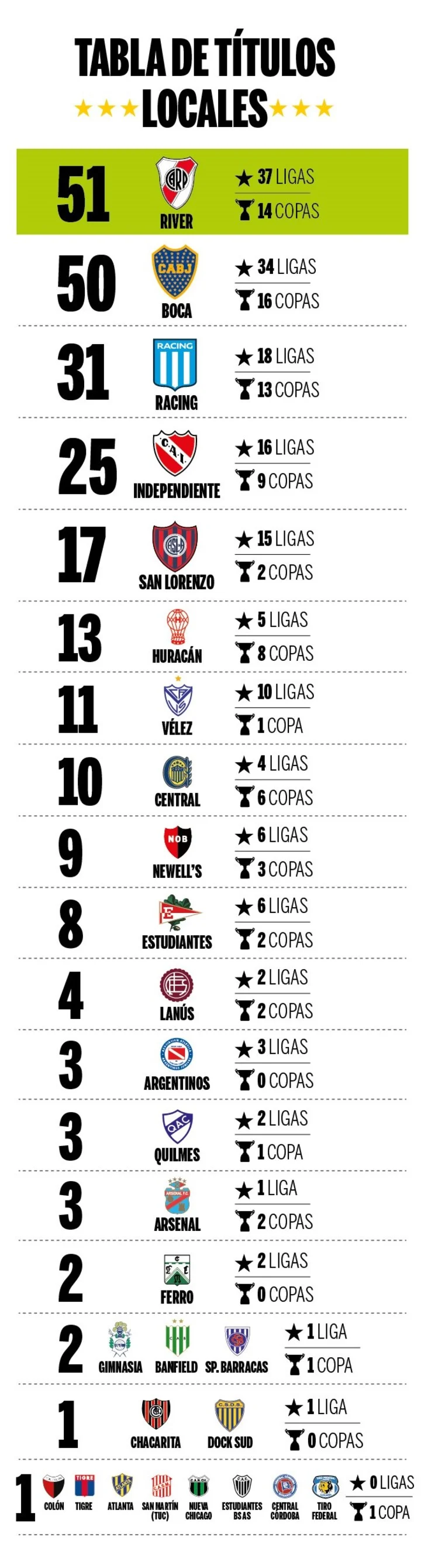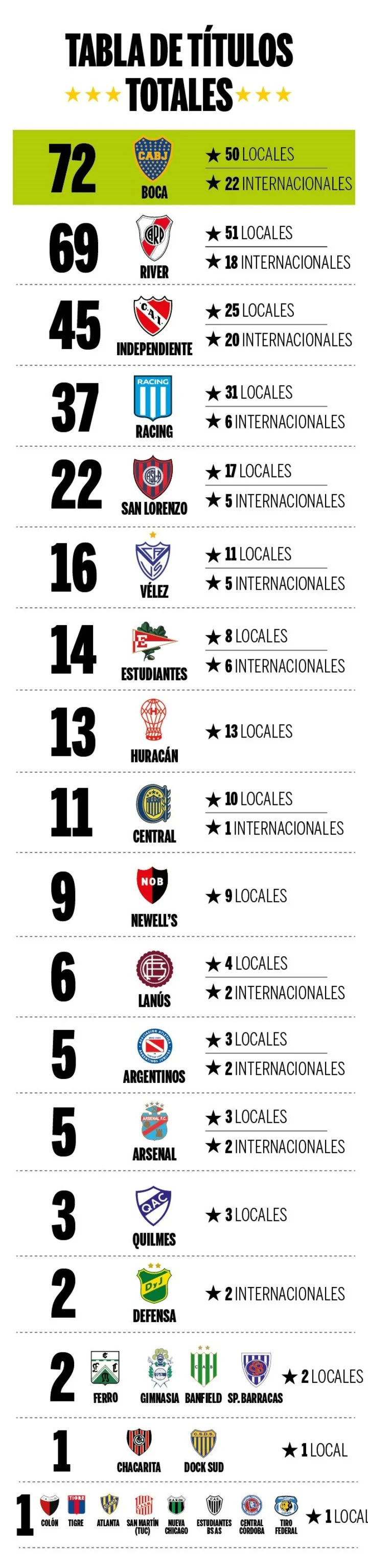 En la tabla general, contando los torneos y copas argentinas e internacionales, Boca es el más ganador. En total tiene 72 estrellas: 50 torneos en la Argentina, cuatro copas AFA-AUF (quizás una de las más discutidas a la hora de analizar el ranking general) y 18 copas internacionales. River lo sigue de cerca, con 69 títulos: 37 torneos locales, 14 copas nacionales y 18 internacionales. En la tabla sigue Independiente, con 45 (25 nacionales y 20 internacionales); Racing, 38 (31 y 6), y San Lorenzo, 22 (17 y 5).