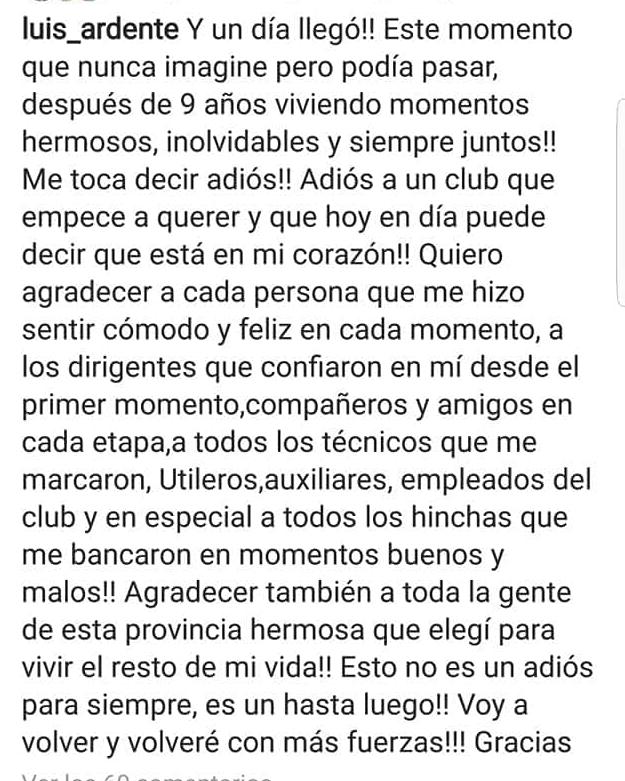 El reconocido arquero de San Martín, Luis Ardente, se despidió del equipo y de los hinchas mediante las redes sociales. El jugador que protegió el arco del Verdinegro escribió sentidas palabras explicando su salida del plantel.