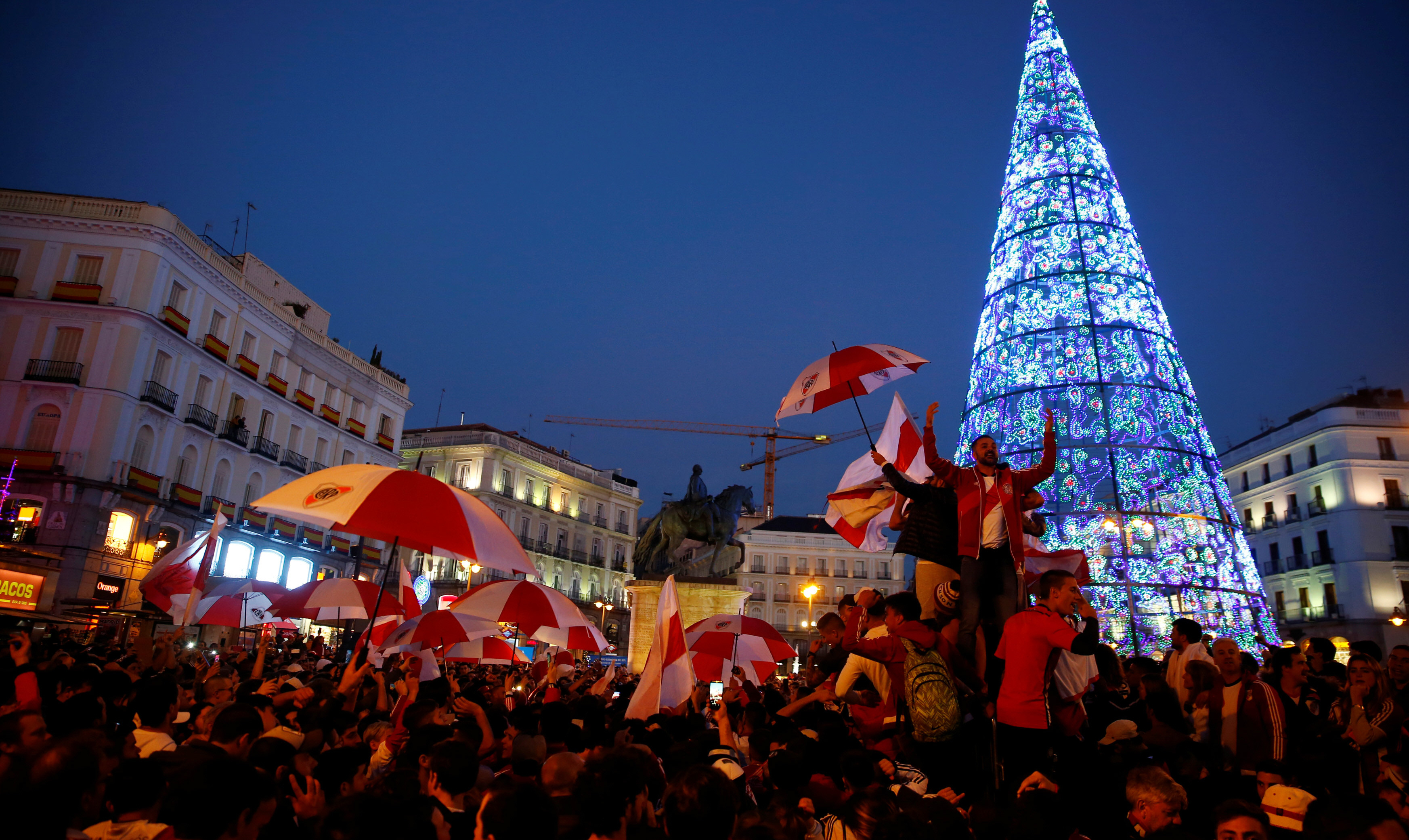 Madrid vivió un día plenamente argentino ayer con los "banderazos" en apoyo a sus equipos que realizaron hinchas de Boca y River. Simpatizantes del "Millo" se concentraron en la emblemática Puerta del Sol, en Madrid, donde sorprendieron a los paseantes de ese característico lugar con cánticos de aliento y apoyo al equipo de Marcelo Gallardo. Con banderas y sombrillas en el anochecer madrileño, y rodeando un árbol de Navidad, centenares de hinchas coparon el lugar a la espera del encuentro de hoy con Boca Juniors, por la final de la Copa Libertadores de América en el Estadio Santiago Bernabéu.