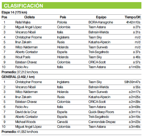 El ciclista polaco Rafal Majka (Bora Hansgrohe) ganó ayer la etapa 14 de la Vuelta a España, disputada entre Écija y Alto de la Sierra de la Pandera con una distancia de 175 kilómetros, mientras que Chris Froome (Sky) controló su renta en la general cruzando la meta junto con Vincenzo Nibali (Bahrain-Merida).