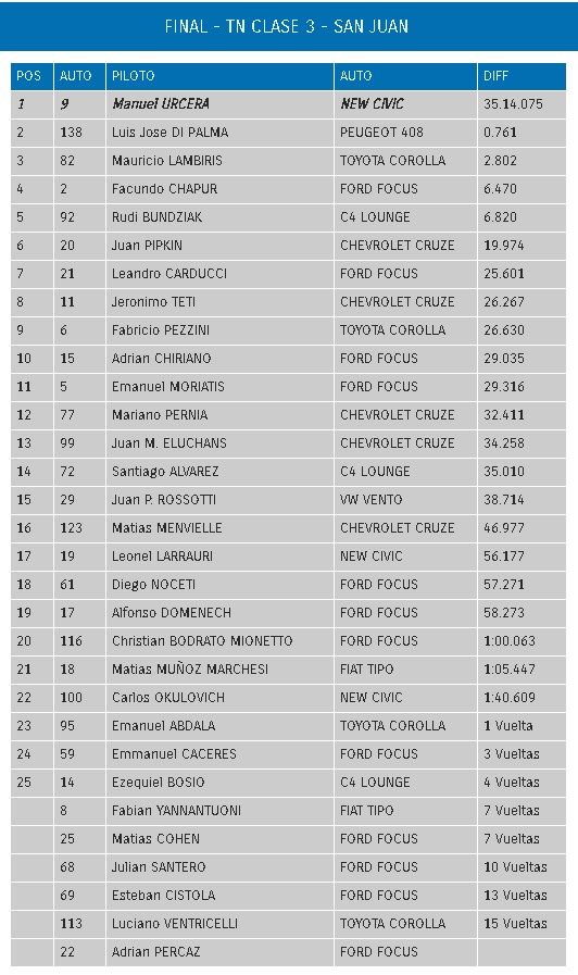 Gran victoria y punta del campeonato para José Manuel Urcera en la tercera fecha de la Clase 3 del Turismo Nacional que se llevó a cabo hoy en El Villicum, luego de una intensa batalla con Josito Di Palma, luego del abandono de Santero. Mauricio Lambiris luchó con Chapur desde el inicio y se quedó con la tercera posición.