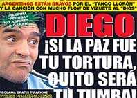 El diario sensacionalista Extra le apuntó, como ayer, a Maradona, con el siguiente título en su portada: "Si La Paz fue una tortura, Quito será tu tumba. Ecuador va a comer un asadito".