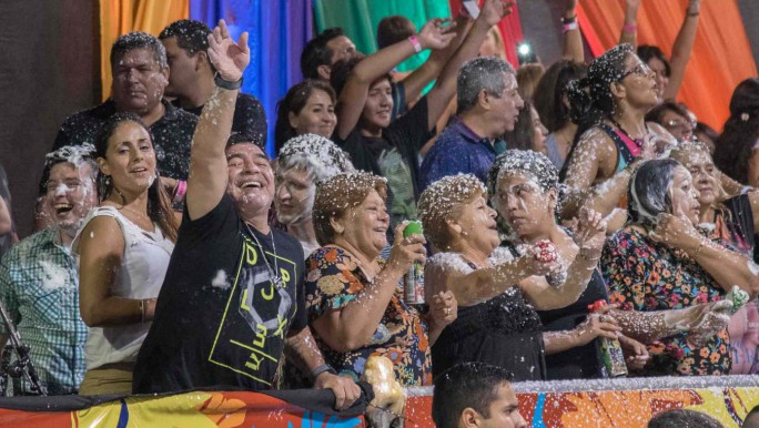 El corsódromo "Nolo Alías" fue epicentro una vez más del desfile de más de 2.500 comparseros, escuelas de samba y carrozas, en medio de una fiesta de nieve, cánticos y aplausos del publico que llenó las tribunas. Los festejos contaron, la noche del domingo, con la presencia del referente mundial del fútbol Diego Armando Maradona quien, al igual que el sábado, se divirtió en la celebración del "Momo" y hasta se animó a unos pasos de baile en la pista, junto a las bastoneras de las comparsas Copacabana y Sapukay.