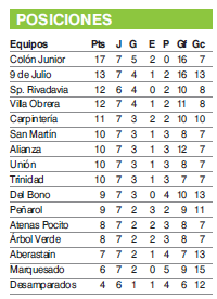 En la punta, Colón Junior sigue su marcha implacable tras haber goleado 4-0 a Aberastain este sábado, escoltado ahora por 9 de Julio.