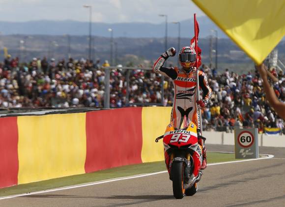 Marc Márquez (Repsol Honda RC 213 V), Nicolás Terol (Suter) y Alex Rins (Estrella Galicia 0’0 KTM) volvieron a refrendar la supremacía española en el campeonato del mundo de motociclismo al imponerse en sus respectivas categorías del Gran Premio de Aragón que se disputó en el complejo Motorland de Alcañiz (Teruel).
