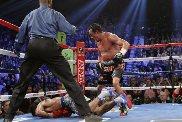El mexicano Juan Manuel Márquez noqueó ante noche en el sexto round de manera espectacular al filipino Manny Pacquiao, en una pelea sin título en juego disputada en el MGM Grand Arena Garden de Las Vegas.
