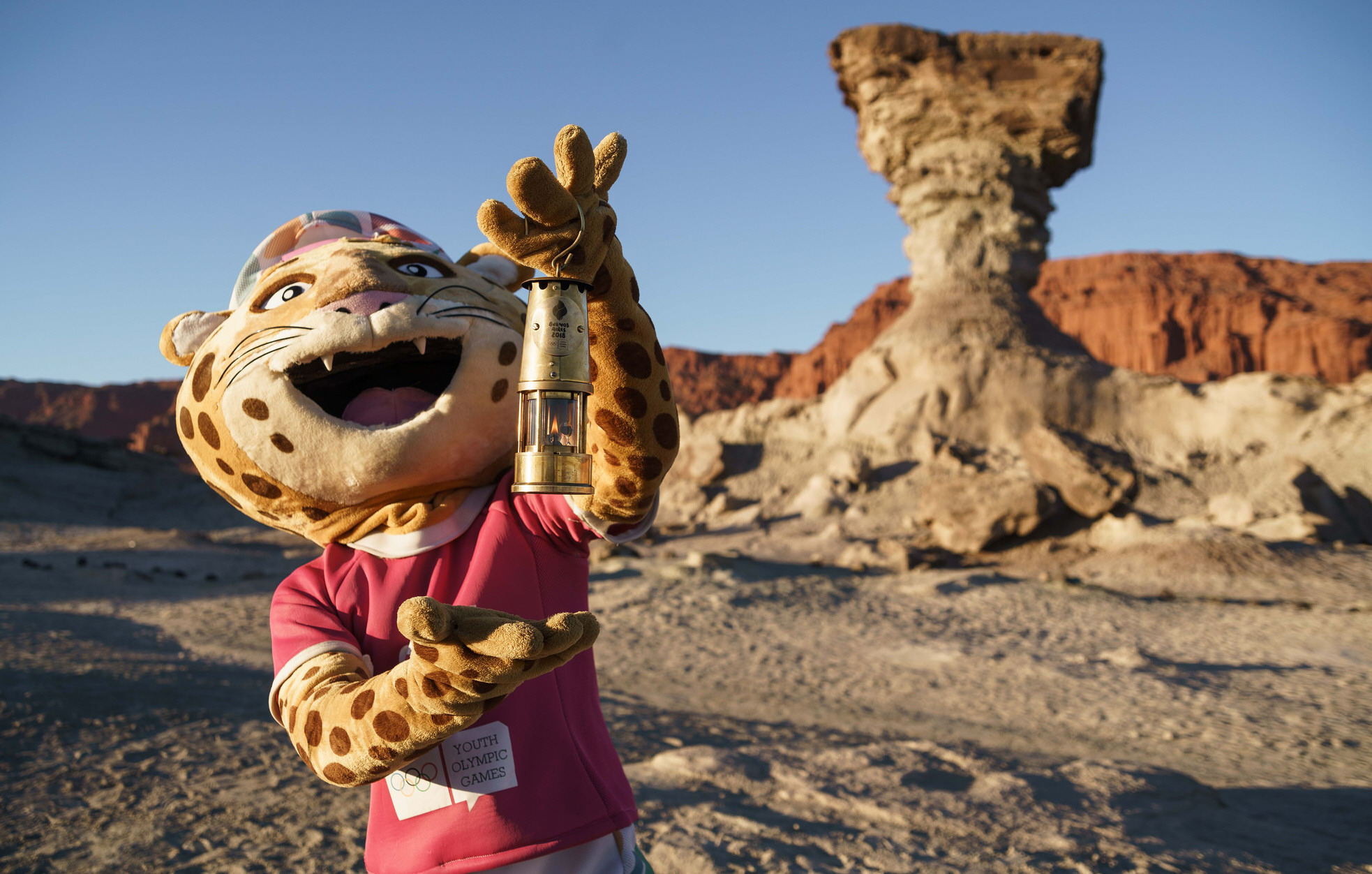 Ícono. La mascota de los JJ.OO de la Juventud estuvo ayer en el Parque Ischigualasto y hoy tendrá como destino el centro capitalino.