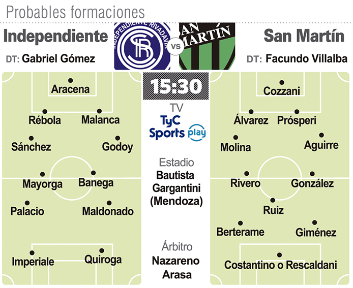 No son tiempos de paz para el Atlético San Martín. En el cierre de la primera rueda de la Primera Nacional, otro capricho del fútbol lo pone de cara a la salvación porque los clásicos son para ganarlos y hoy, desde las 15,30 tendrá la chance de levantarse cuando visite a Independiente Rivadavia en Mendoza, como parte de la fecha 17 de la Zona B. Ese será el único y gran objetivo a cortísimo plazo dentro del presente complejo del Verdinegro que hace rato no gana, viene de perder como local y está hundido en el fondo de las posiciones, demasiado lejos de las pretensiones e ilusiones de su gente. El ciclo de Luigi Villalba no ha podido cuajar aún en un triunfo y luego de dos prometedores empates contra Gimnasia de Jujuy e Instituto de Córdoba, tocó fondo contra Barracas Central. Ahí, el click de la necesidad se adueñó de los días de San Martín y hoy tendrá un durísimo examen ante la Lepra mendocina que venía prendido arriba y hoy quiere volver a recuperar el terreno perdido. En la formación de San Martín no se esperan demasiadas modificaciones de fondo ni de nombres. El plantel está armado, sólo llegó un refuerzo y para Facundo Villalba las opciones no son tan amplias. Es clásico y para San Martín, ganarlo ya es urgencia, sea como sea para tratar de volver a empezar.