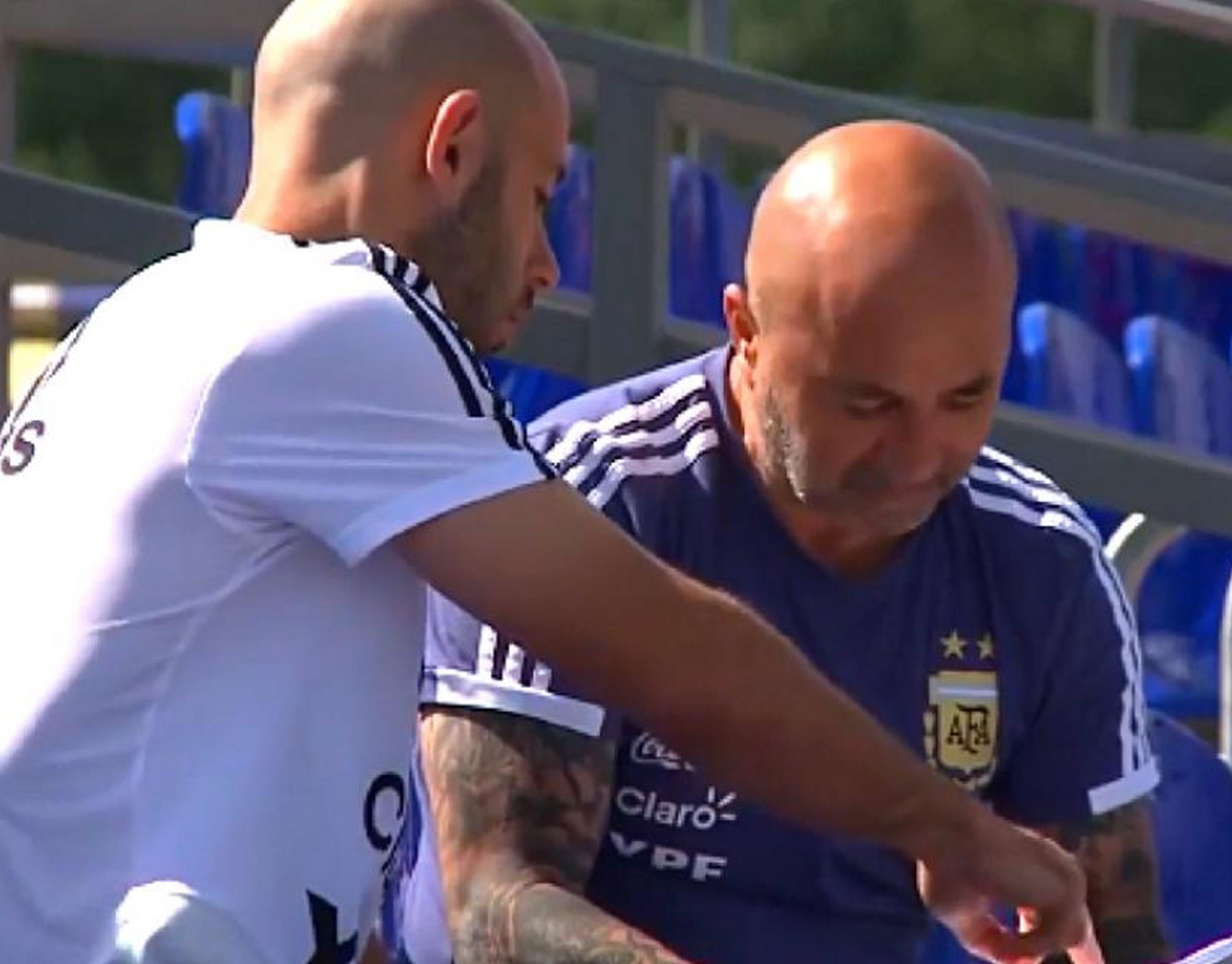 En el Mundial. La foto de Mascherano indicándole a Sampaoli aún es recordada, pues surgió en medio de la polémica sobre quién dirigía el equipo.