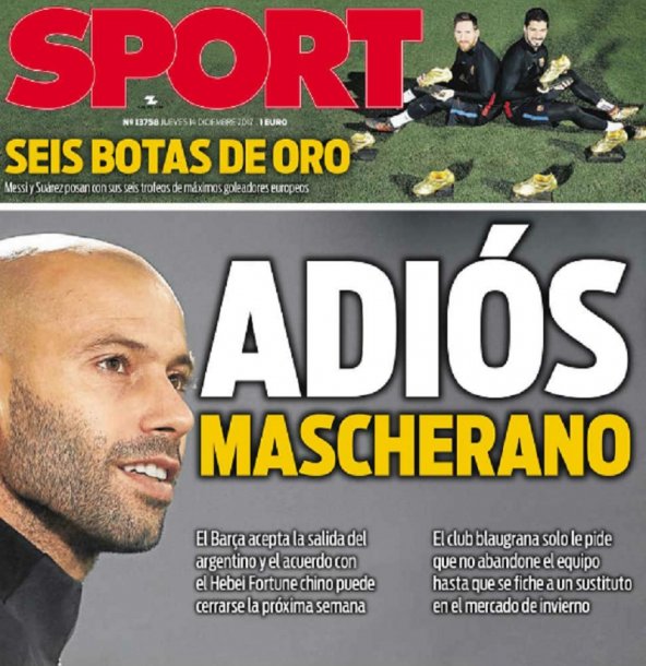 El diario catalán Sport publicó esta jueves: “No hay vuelta atrás; Mascherano no finalizará la temporada defendiendo la camiseta del Barça. La decisión está tomada y el futbolista ha recibido todas las garantías de la cúpula del club para que cierre sin problemas su nuevo contrato” con el Hebei Fortune.