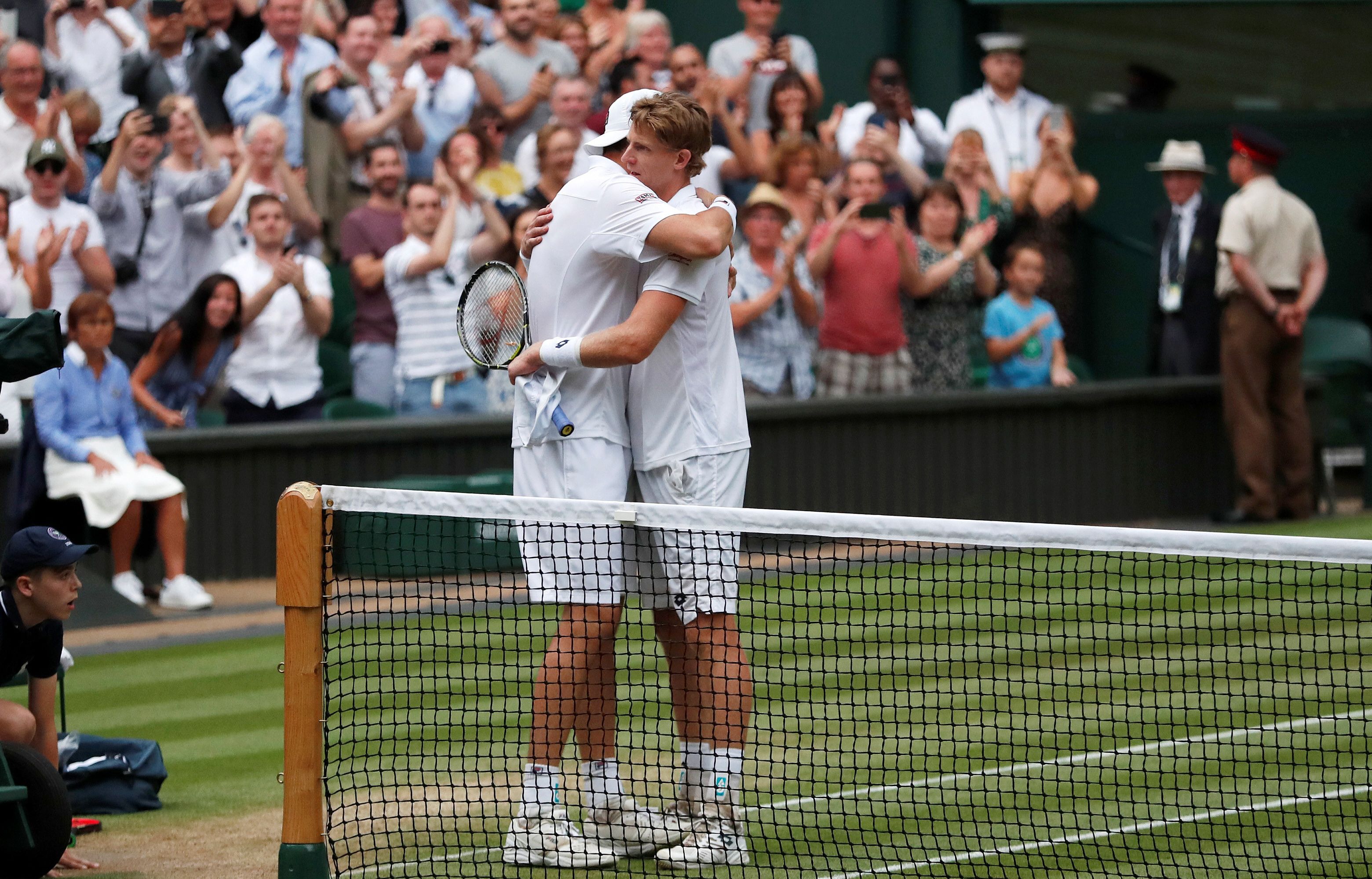 El choque entre Kevin Anderson y John Isner (saludándose en la foto), primera semifinal de Wimbledon, con victoria del primero por 7-6, 6-7, 6-7, 6-4 y 26-24 en 6 horas y 36 minutos, se convirtió en la semifinal más larga de la historia del Grand Slam.