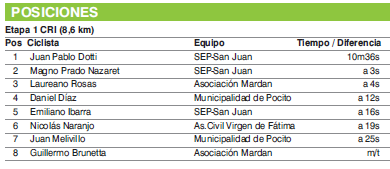 Laureano Rosas, ganador hace una semana de la Doble Calingasta, volvió a demostrar ayer que está en un gran nivel. Fue tercero en la CRI detrás de Dotti y Prado, pero quedó a solo 4 segundos del líder, por eso al culminar la etapa el oriundo de Las Flores expresó: "Me voy muy contento y satisfecho por lo logrado, porque buscamos hacer un buen entrenamiento para la Vuelta a San Juan, medianamente estamos en la misma distancia de la Vuelta por eso todo esto vale y mucho". Sobre la etapa de hoy en donde el protagonismo principal estará entre su equipo y los "bichos verdes", el ciclista de Mardan manifestó: "El SEP metió dos ciclistas con un gran tiempo así que seguramente que la pelea de mañana (por hoy) será cabeza a cabeza. En las últimas carreras los dos equipos venimos siendo protagonistas y está bueno, damos un lindo espectáculo".