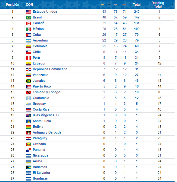 Hasta el momento, la delegación acumula 79 medallas: 22 de oro, 29 de plata y 28 de bronce. Y se ubica en la sexta posición de la tabla general por detrás de Estados Unidos, Brasil, Canadá, México y Cuba.