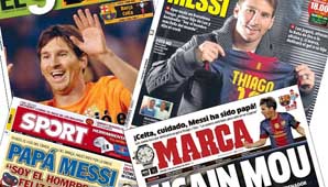 “Papá Messi” eligieron dos de los diarios deportivos más importantes, como Mundo deportivo y Sport, para titular el nacimiento de Thiago. ¡Celta cuidado, Messi ha sido papá! avisó Marca en su tapa. Si está en condiciones, Lionel jugará esta tarde en el Barcelona y saldrá a la cancha con la felicidad de haber sido papá.