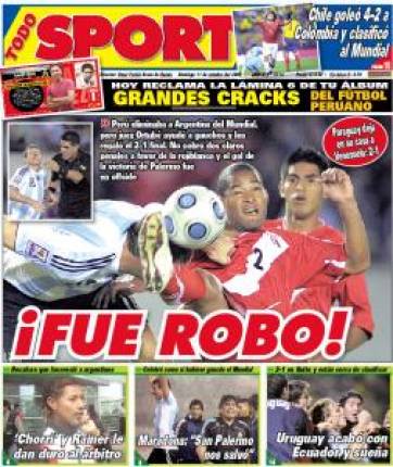 Buenos Aires, 11 de octubre.- íFue robo!, tituló Todo Sport, y luego amplió su descontento: "Perú eliminaba a Argentina del Mundial, pero juez Ortubé ayudó a gauchos y les regaló el 2-1 final. No cobró dos claros penales a favor de la rojiblanca y el gol de la victoria de Palermo fue en offside".