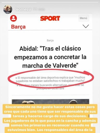 Con una carta a través de redes sociales, Lionel Messi reveló las internas en Barcelona entre jugadores y dirigentes, luego de unas declaraciones de Éric Abidal, responsable del área deportiva, quien aseguró que "muchos jugadores no estaban satisfechos ni trabajaban mucho" en el ciclo de Ernesto Valverde.