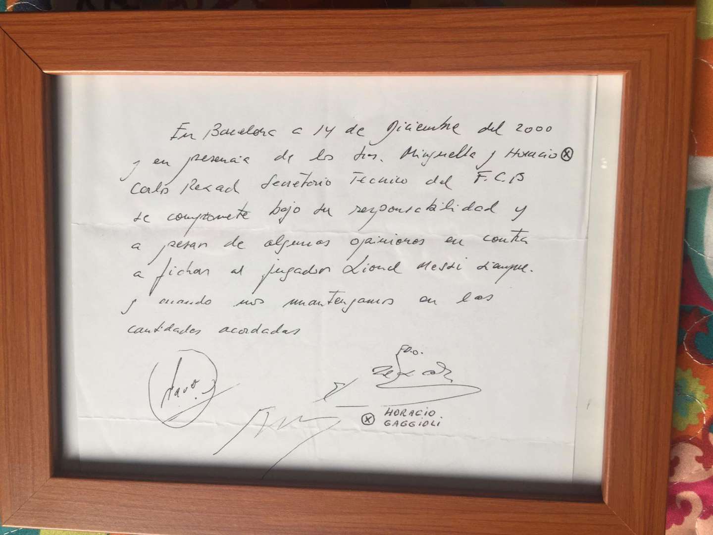 Fue el 14 de diciembre de 2000 el día en que Lionel Messi firmó su primer contrato con el Fútbol Club Barcelona, redactado en la cafetería del Club de Tennis Pompeia de esa ciudad de España. “En presencia de los Sres. Minguella y Horacio (Gaggioli), Carles Rexach, secretario técnico del FC Barcelona, se compromete bajo su responsabilidad y a pesar de algunas opiniones en contra a fichar al jugador Lionel Messi siempre y cuando nos mantengamos en las cantidades acordadas”, indica el hoy célebre documento.
