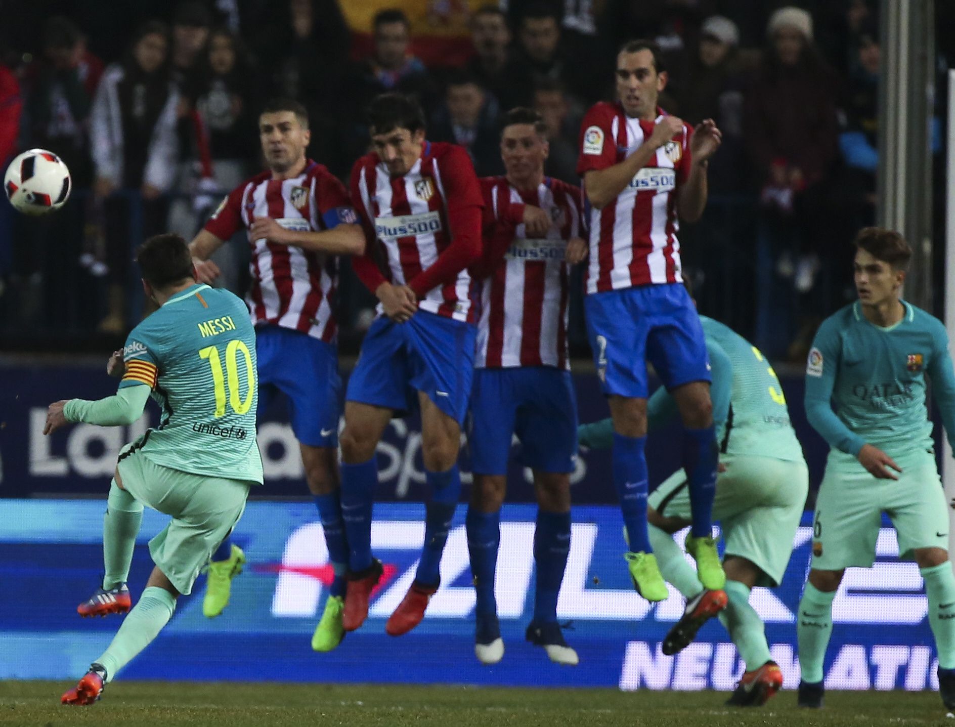 Lionel Messi anotó ayer un gol en el triunfo de Barcelona sobre Atlético de Madrid por 2-1 como visitante, en el encuentro de ida de la semifinal de la Copa del Rey de España. El argentino marcó a los 33 minutos del primer tiempo pero previamente abrió el tanteador el delantero uruguayo Luis Suárez (7m.). El francés Antoine Griezmann descontó para los conducidos por Diego Simeone, a los 14m. del segundo tiempo.