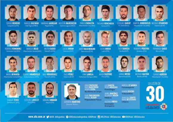 Buenos Aires, 11 de mayo.- El entrenador de la Selección Argentina, Gerardo Martino, dio a conocer esta tarde la lista inicial de 30 convocados para la Copa América de Chile, que se jugará desde el 11 de junio al 4 de julio próximos.
